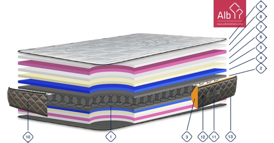 Housing springs bonnel orthopedic system stabilizer with double hoop steel | Board of cotton and acrylic thermo-fixed felt | Extra comfort system | Enhancing side | NT fabric support | Flexible polyurethane foam | Hypoallergenic polyester fiber | Strech fabric | Side padded with handles and decorative vents | Continuous embroidery | Height: ±25cm